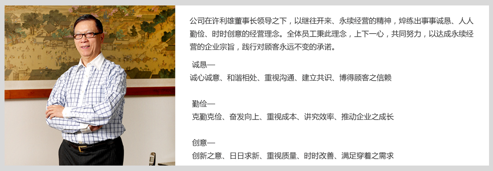 本公司在許利雄董事長領(lǐng)導(dǎo)之下,以繼往開來、永續(xù)經(jīng)營的精神,焠練出事事誠懇、人人勤儉、時時創(chuàng)意的經(jīng)營理念。
