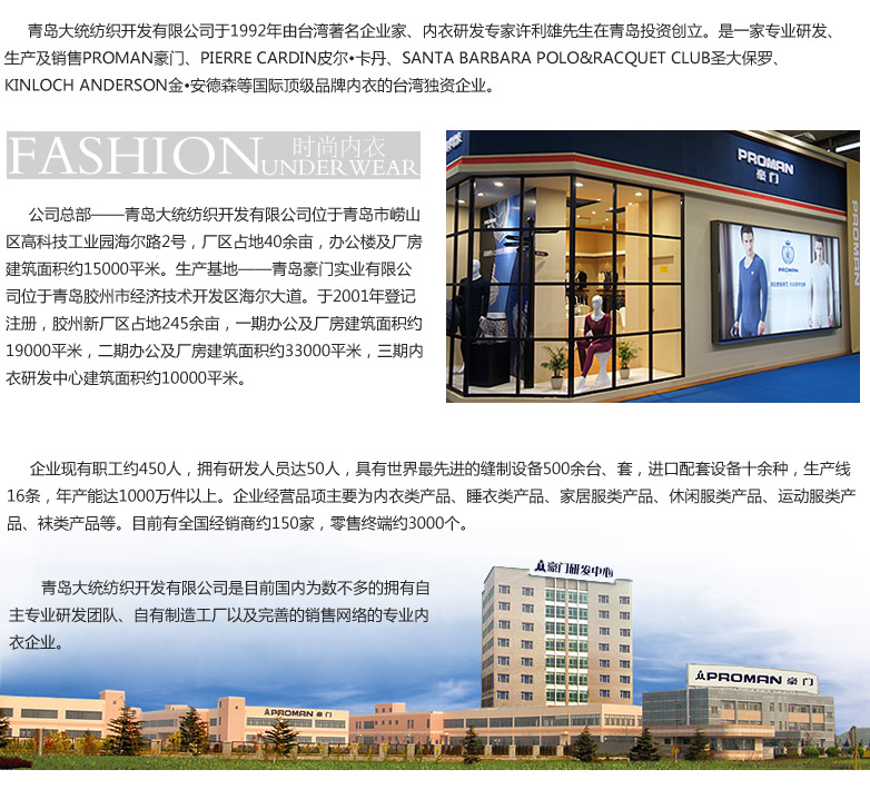 青島大統(tǒng)紡織開發(fā)有限公司 郵 編:266100 傳 真:(0532)80992564 總 機(jī):(0532)80992889 豪門事業(yè)處:(0532)80992536 圣大保羅事業(yè)處:(0532)80992567 皮爾卡丹內(nèi)衣事業(yè)處:(0532)80992507 皮爾卡丹家居事業(yè)處:(0532)80992559 地址:青島市海爾路2號